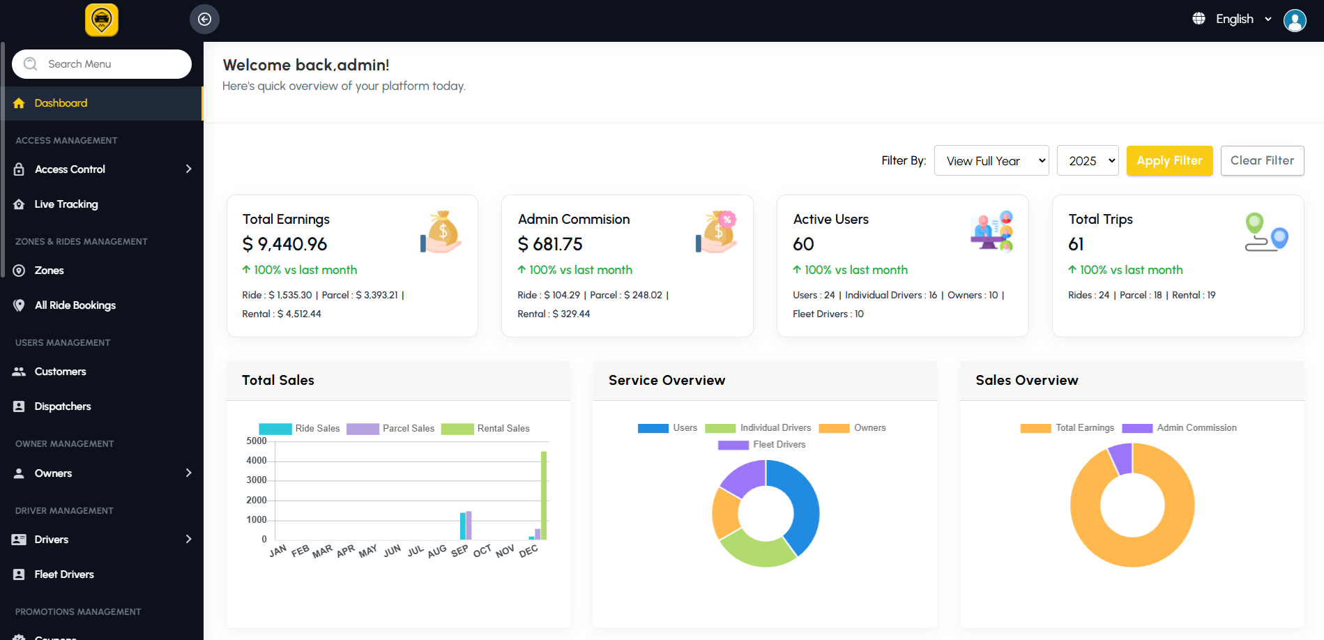 Provides an at-a-glance overview of the business. Displays analytics such as total customers, registered drivers, completed rides, parcels, rentals, latest rides, top drivers, and overall earnings overview. Helps admins quickly monitor performance.