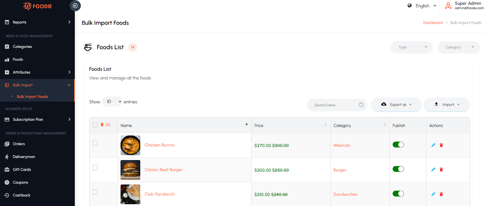 This section allows administrators to upload multiple food items at once using a CSV file, streamlining the process of adding products to the platform. Restaurants can quickly import their menu items, including details like name, price, category, and attributes, without manually creating each entry. Admins can manage the import process, ensure data accuracy, handle errors, and make it easier for restaurants to keep their stores updated efficiently.