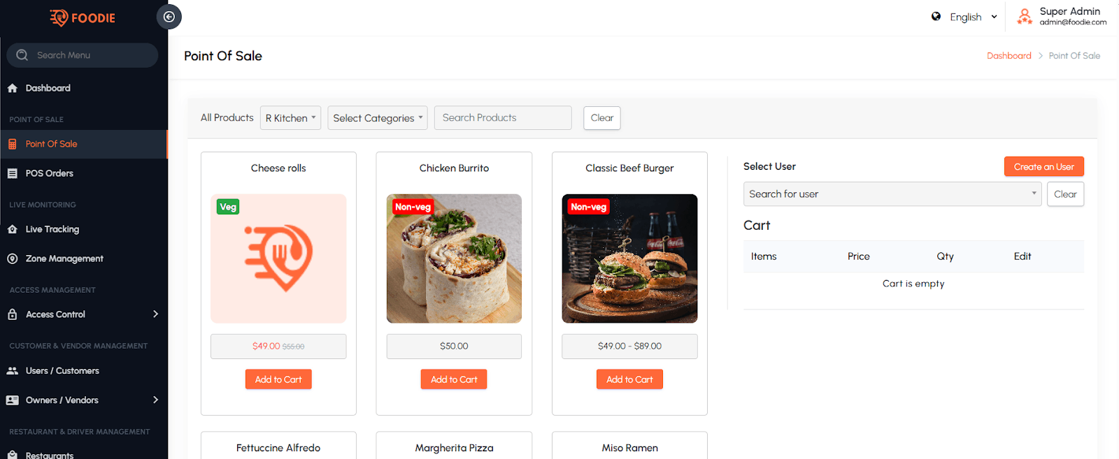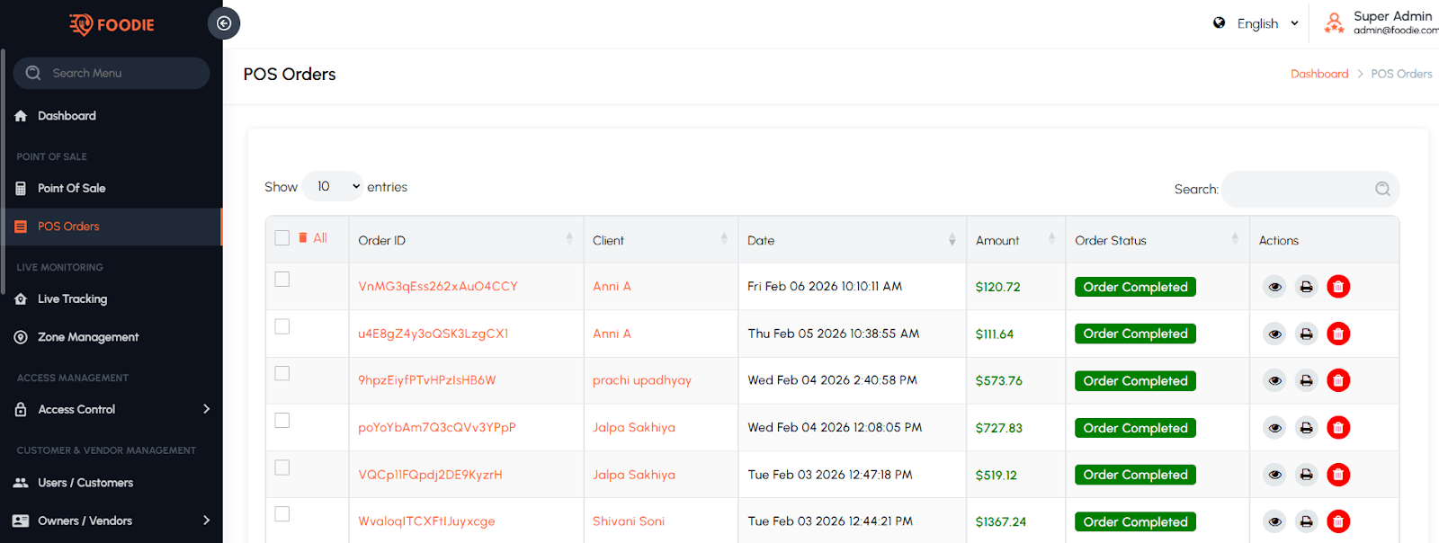 View and manage all orders generated through the Point of Sale system. This section provides access to order details, item breakdowns. It helps track sales activity, resolve disputes, generate reports, and maintain accurate records