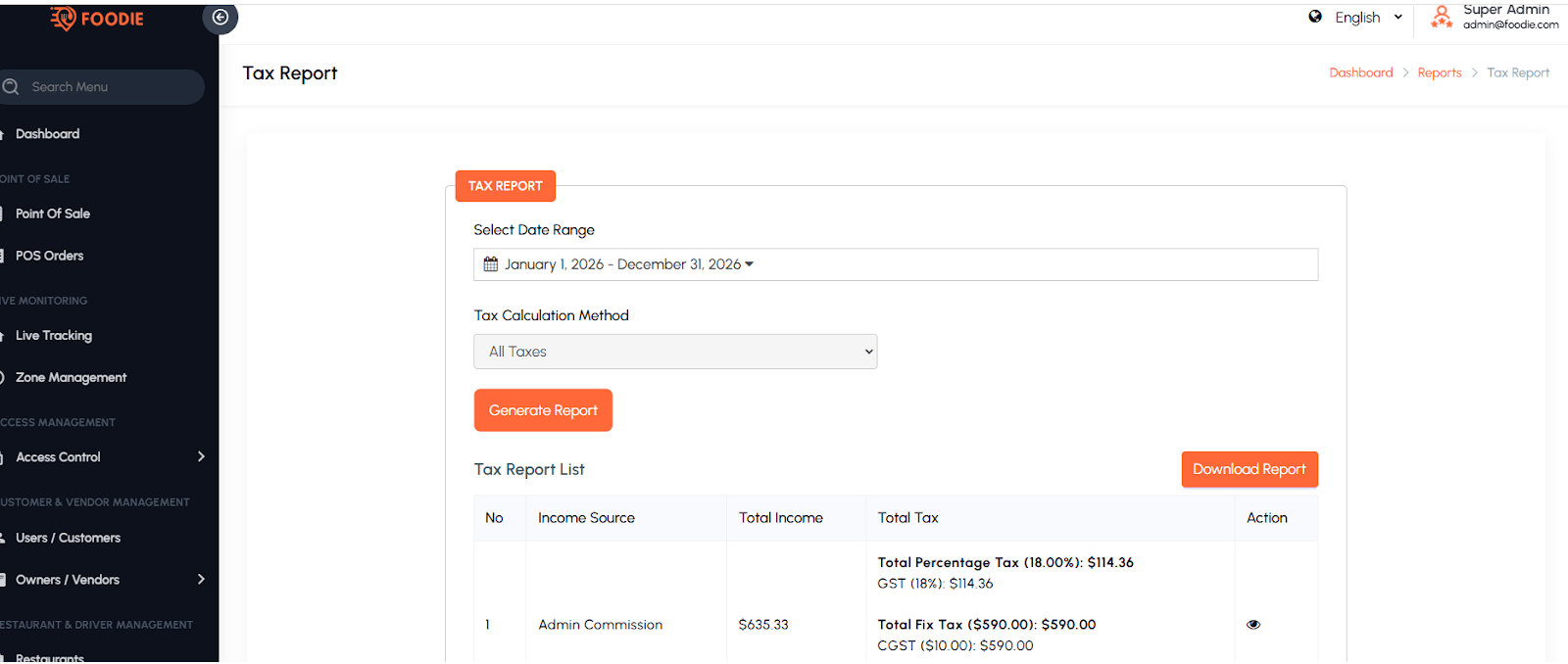 This section provides a detailed overview of the platform’s sales performance and transaction history. Administrators can track total orders, revenue, commissions, and payment summaries over specific date ranges. Reports can be filtered by vendor, customer, or delivery type for deeper insights. It helps analyze business trends, monitor growth, and identify top-performing vendors or menu items. The data can also be exported for accounting or financial analysis, ensuring complete transparency and accurate record-keeping.