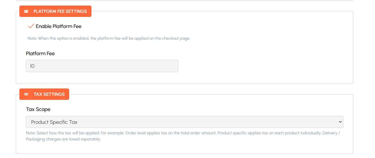 Admins can also select which tax scope applies for users, allowing flexibility to apply taxes at either the product level or order level. Also Platform Fee and Packing Charge is enabled, the configured tax will also apply to these components. This setting located under Settings > Global Settings