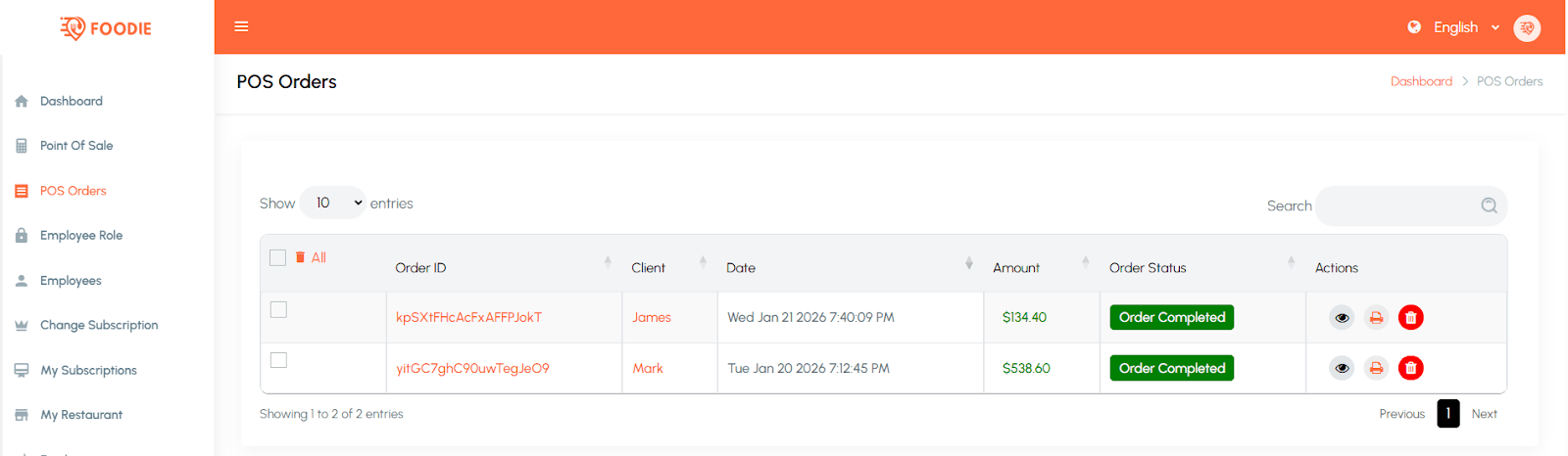 View and manage all orders generated through the Point of Sale system. This section provides access to order details, item breakdowns. It helps track sales activity, resolve disputes, generate reports, and maintain accurate records